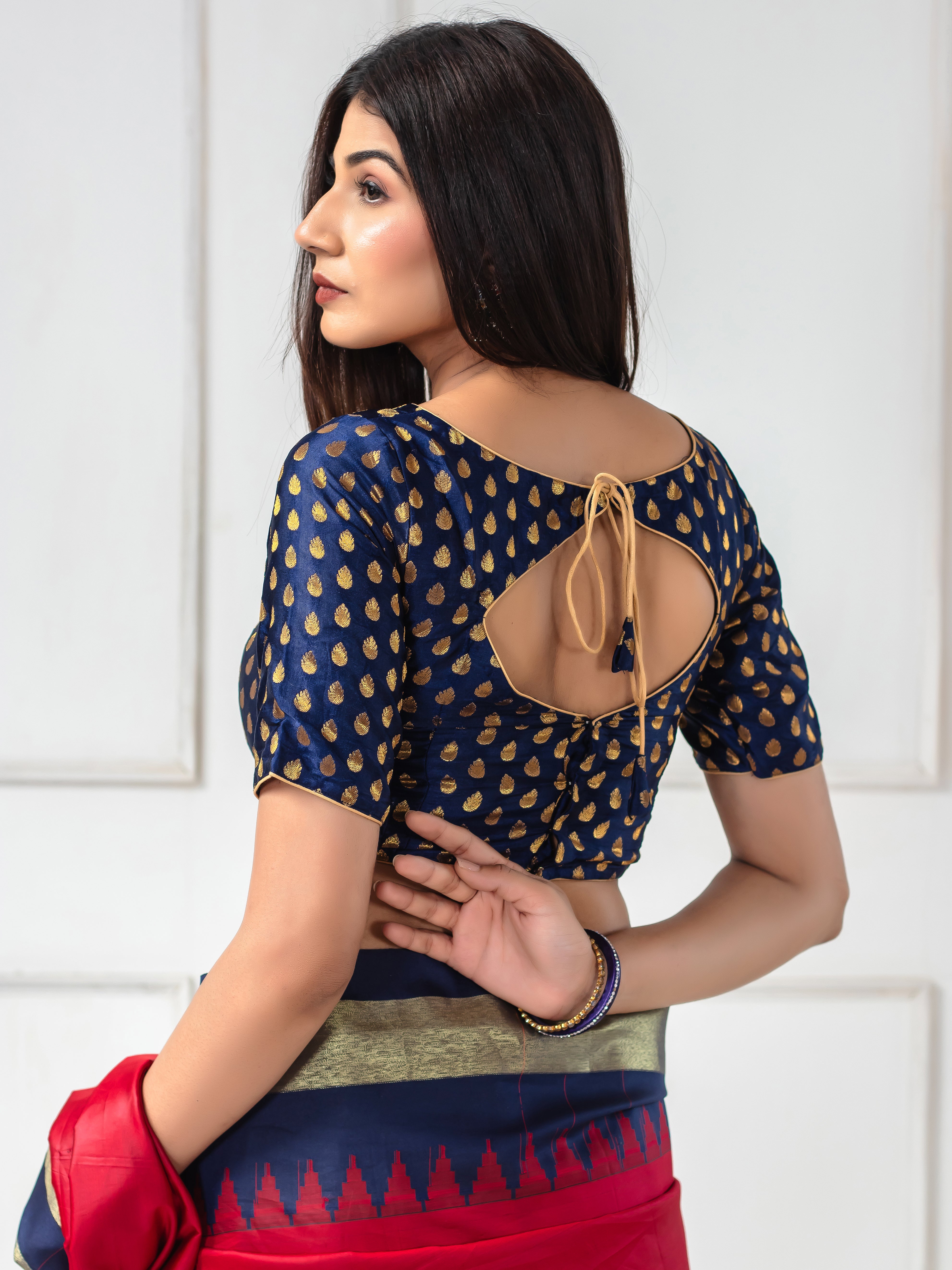 Navy Blue Zari Bandhej Woven Dola Silk Blouse with sleeves