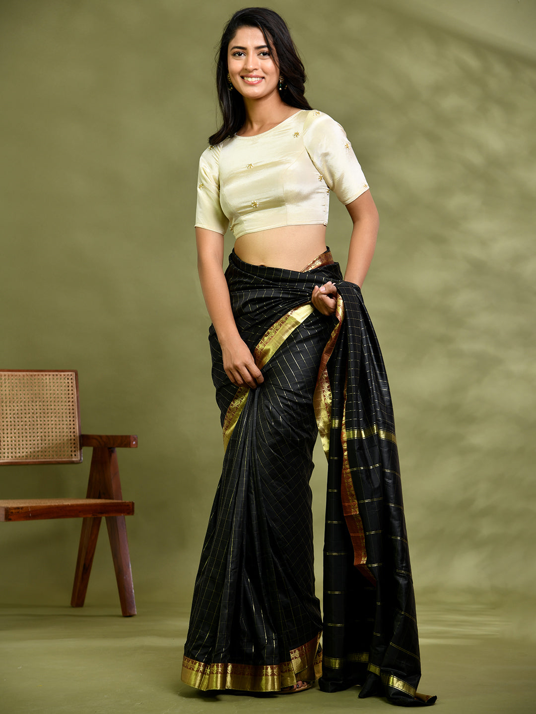 Black Silk V Neck Blouse With Golden Motifs