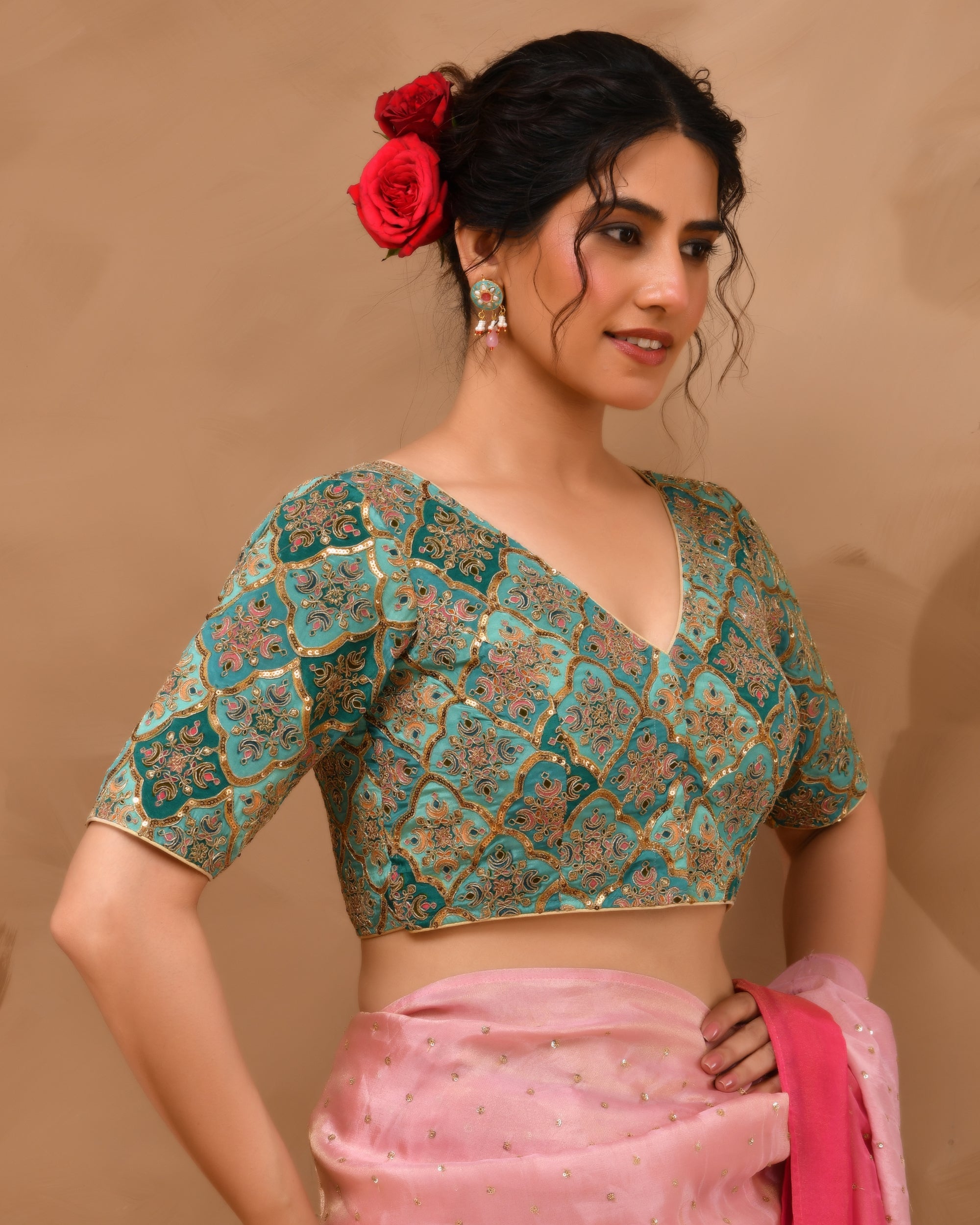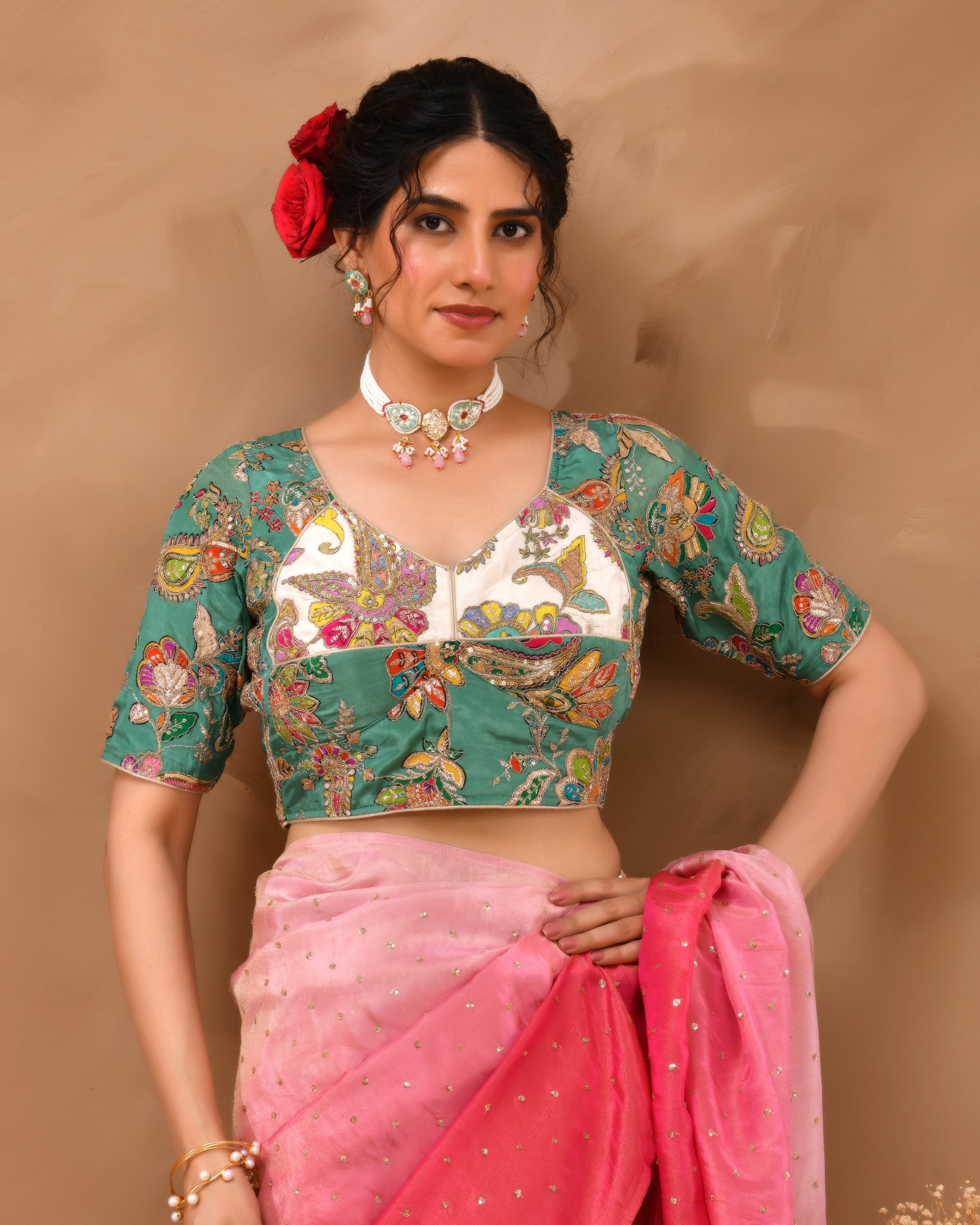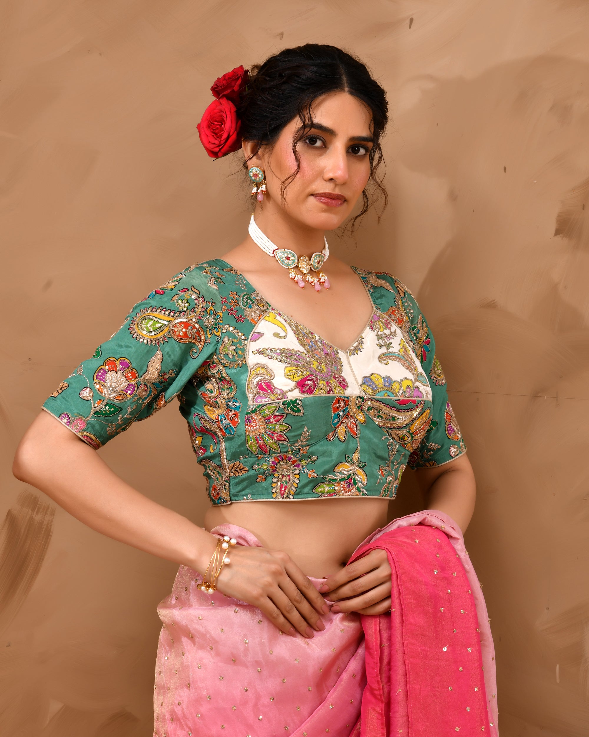 Multicolored Zari Embroidered Glass Neck Blouse With Sleeves