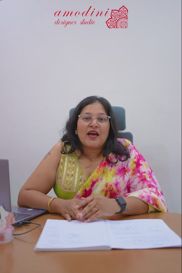 Crafted in traditional bandhej/bandhani print , this blouse features a V neckline in sabhyasachi pattern. This blouse is a vibrant pick for wedding & festive occasions. This blouse has a elbow length sleeves with back closure.