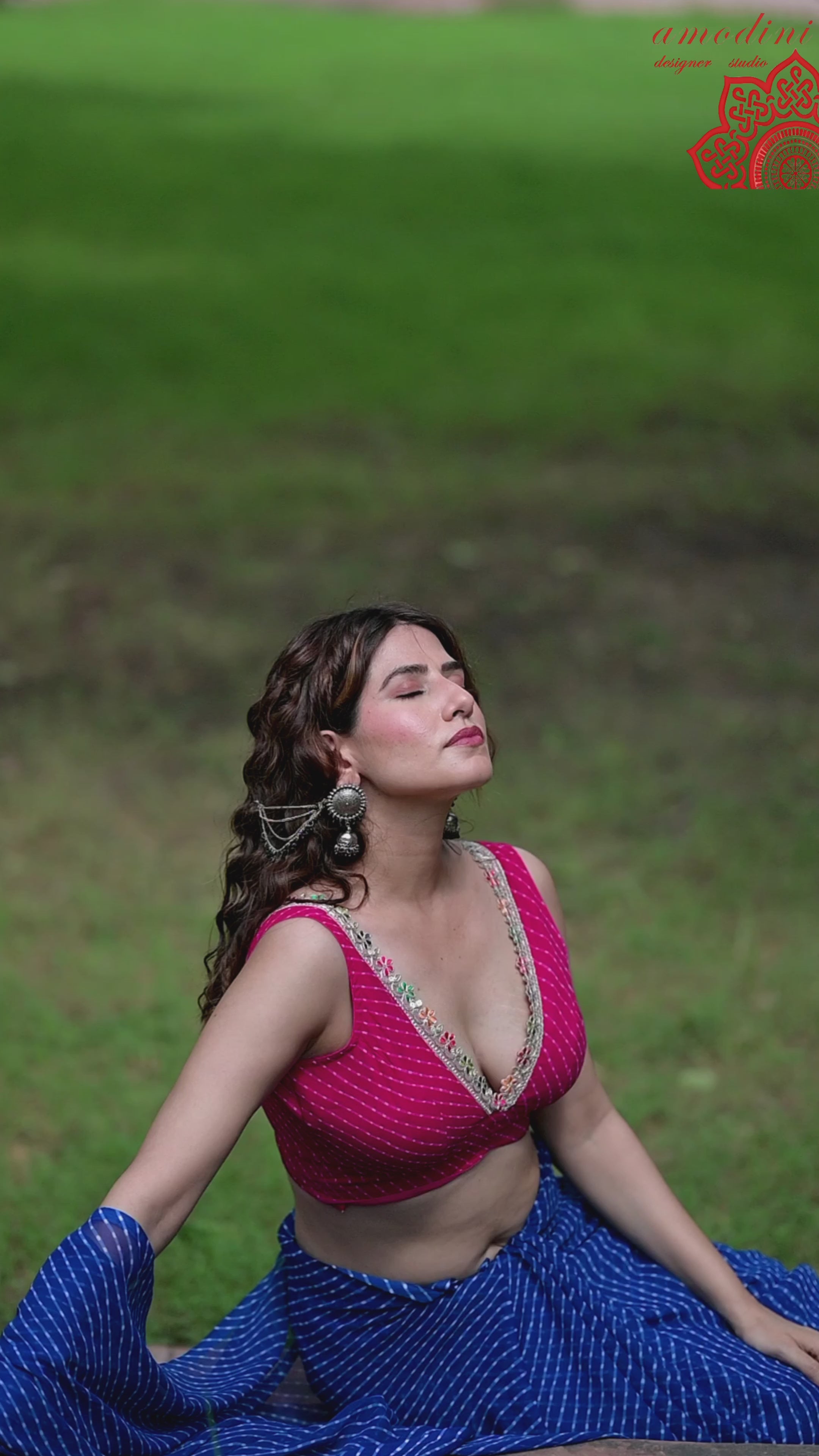 Brighten your ethnic wardrobe with this graceful Lehriya pink printed sleeveless saree blouse, highlighted with delicate multicolour embroidery along the neckline. Rooted in traditional Rajasthani aesthetics yet styled for the modern woman, this blouse effortlessly blends charm and sophistication.